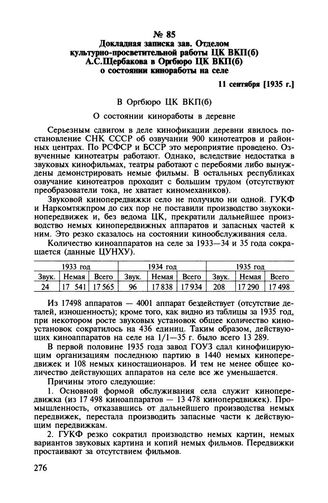 Докладная записка зав. Отделом культурно-просветительной работы ЦК ВКП(б) А.С. Щербакова в Оргбюро ЦК ВКП(б) о состоянии киноработы на селе. 11 сентября [1935 г.]