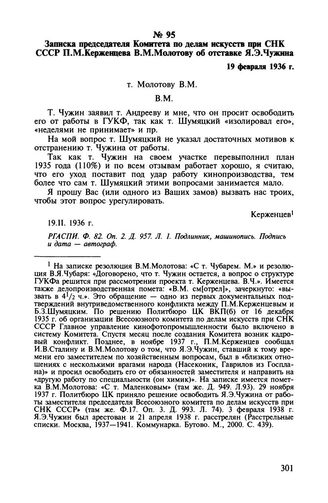 Записка председателя Комитета по делам искусств при СНК СССР П.М. Керженцева В.М. Молотову об отставке Я.Э. Чужина. 19 февраля 1936 г. // РГАСПИ. Ф. 82. Оп. 2. Д. 957. Л. 1. Подлинник, машинопись. Подпись и дата-автограф.