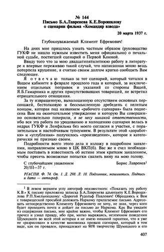 Письмо Б.А. Лавренева К.Е. Ворошилову о сценарии фильма «Командир взвода». 20 марта 1937 г.