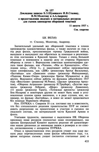 Докладная записка Б.З. Шумяцкого И.В. Сталину, В.М. Молотову и А.А. Андрееву о предоставлении людских и материальных ресурсов для съемок кинокартин оборонной тематики. 11 августа 1937 г.