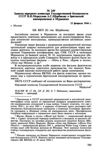 Записка народного комиссара Государственной безопасности СССР В.Н. Меркулова А.С. Щербакову о британской кинопропаганде в Мурманске. 12 февраля 1944 г. // РГАСПИ. Ф. 17. Оп. 125. Д. 292. Л. 7. Подлинник, машинопись. Подпись-автограф.