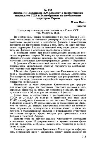 Записка И.Г. Большакова В.М. Молотову о распространении кинофильмов США и Великобритании на освобожденных территориях Европы. 20 мая 1944 г.