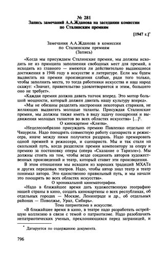 Запись замечаний А.А. Жданова на заседании комиссии по Сталинским премиям. [1947 г.]
