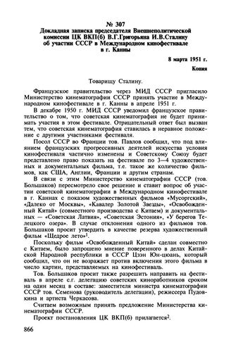 Докладная записка председателя Внешнеполитической комиссии ЦК ВКП(б) В.Г. Григорьяна И.В. Сталину об участии СССР в Международном кинофестивале в г. Канны. 8 марта 1951 г. // РГАСПИ. Ф. 82. Оп. 2. Д. 958. Л. 85-86. Подлинник, машинопись. Подписи-автографы.