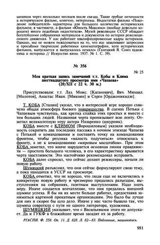 Записи бесед Б.З. Шумяцкого с И.В. Сталиным при просмотре кинофильмов. Моя краткая запись замечаний т.т. Кобы и Клима шестнадцатого просмотра ими «Чапаева» (20/XII с 22 ч. 30 м.)
