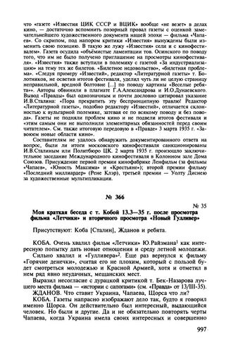 Записи бесед Б.З. Шумяцкого с И.В. Сталиным при просмотре кинофильмов. Моя краткая беседа с т. Кобой 13.3-35 г. после просмотра фильма «Летчики» и вторичного просмотра «Новый Гулливер»