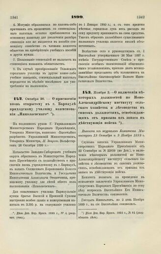 1899. Ноября 2. — О включении некоторых должностей по Ново-Александрийскому институту сельского хозяйства и лесоводства в список должностям, освобождающим от призыва из запаса в действующие войска. Выписка из журналов Комитета Министров 19 Октября...