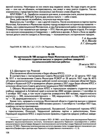 Из протокола № 108 заседания бюро Молотовского обкома КПСС — «О посылке студентов высших и средних учебных заведений на сельскохозяйственные работы». г. Молотов. 29 августа 1957 г.