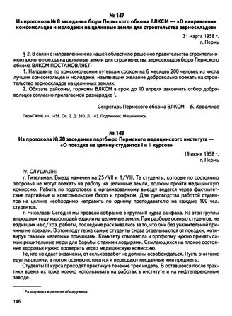 Из протокола № 8 заседания бюро Пермского обкома ВЛКСМ — «О направлении комсомольцев и молодежи на целинные земли для строительства зерноскладов». г. Пермь. 31 марта 1958 г. // ПермГАНИ. Ф. 1458. Оп. 2. Д. 310. Л. 143. Подлинник. Машинопись.