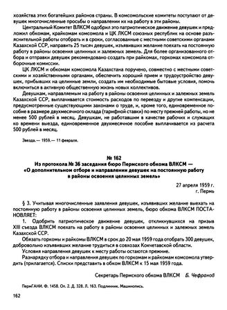 Из протокола № 36 заседания бюро Пермского обкома ВЛКСМ — «О дополнительном отборе и направлении девушек на постоянную работу в районы освоения целинных земель». г. Пермь. 27 апреля 1959 г. // ПермГАНИ. Ф. 1458. Оп. 2. Д. 328. Л. 163. Подлинник. Машинопись.