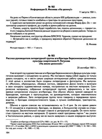 Рассказ руководителя литературной группы агитбригады Березниковского Дворца культуры энергетиков П. Петухова «На земле целинной». 20 сентября 1961 г. // Молодая гвардия. — 1961. — 20 сентября.