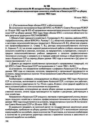 Из протокола № 46 заседания бюро Пермского обкома КПСС — «О направлении механизаторов сельского хозяйства в Казахскую ССР на уборку урожая 1962 года». г. Пермь. 19 июля 1962 г.