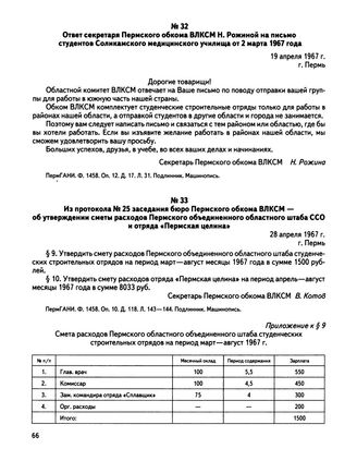 Приложение к § 9 протокола № 25 заседания бюро Пермского обкома ВЛКСМ. Смета расходов Пермского областного объединенного штаба студенческих строительных отрядов на период март—август 1967 г. // ПермГАНИ. Ф. 1458. Оп. 10. Д. 118. Л. 164. Заверенная копия. Машинопись.