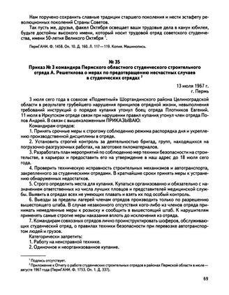 Приказ № 3 командира Пермского областного студенческого строительного отряда А. Решетилова о мерах по предотвращению несчастных случаев в студенческих отрядах. г. Пермь. 13 июля 1967 г. // ПермГАНИ. Ф. 1753. Оп. 1. Д. 337. Л. 6, 22—24. Заверенная копия. Машинопись.