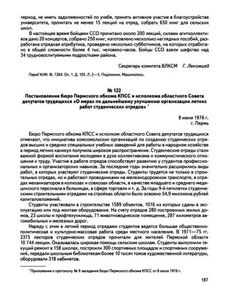 Постановление бюро Пермского обкома КПСС и исполкома областного Совета депутатов трудящихся «О мерах по дальнейшему улучшению организации летних работ студенческих отрядов». г. Пермь. 8 июня 1976 г.