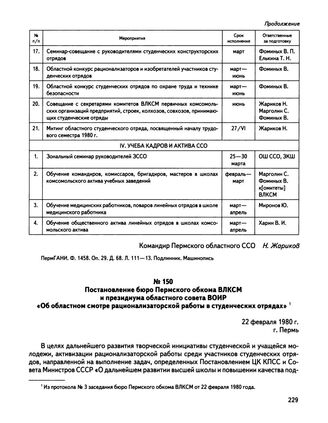Постановление бюро Пермского обкома ВЛКСМ и президиума областного совета ВОИР «Об областном смотре рационализаторской работы в студенческих отрядах». г. Пермь. 22 февраля 1980 г. // ПермГАНИ. Ф. 1458. Оп. 27. Д. 48. Л. 18. Подлинник. Машинопись.