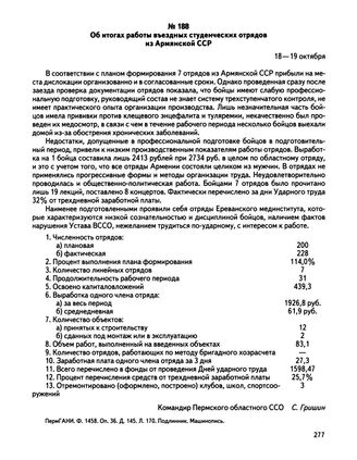 Информации командира Пермского областного ССО С. Гришина о работе студенческих отрядов в 1984 году. Об итогах работы въездных студенческих отрядов из Армянской ССР. г. Пермь. 18-19 октября 1984 г. // ПермГАНИ. Ф. 1458. Оп. 36. Д. 145. Л. 170. Подлинник. Машинопись.