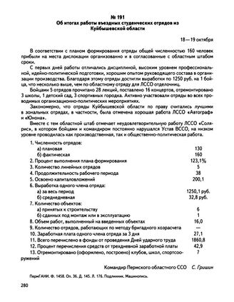 Информации командира Пермского областного ССО С. Гришина о работе студенческих отрядов в 1984 году. Об итогах работы въездных студенческих отрядов из Куйбышевской области. г. Пермь. 18-19 октября 1984 г. // ПермГАНИ. Ф. 1458. Оп. 36. Д. 145. Л. 176. Подлинник. Машинопись.