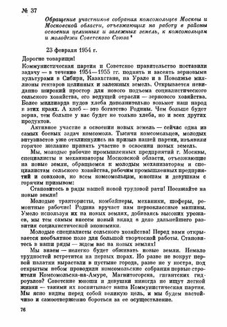 Обращение участников собрания комсомольцев Москвы и Московской области, отъезжающих на работу в районы освоения целинных и залежных земель, к комсомольцам и молодежи Советского Союза. 23 февраля 1954 г.