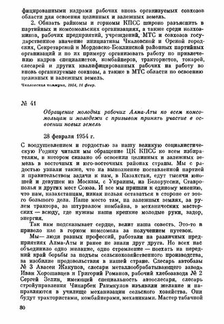 Обращение молодых рабочих Алма-Аты ко всем комсомольцам и молодежи с призывом принять участие в освоении новых земель. 28 февраля 1954 г. // Казахстанская правда, 1954, 28 февр.