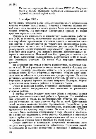 Из статьи секретаря Омского обкома КПСС Е. Колущинского о борьбе областной партийной организации за сибирский миллиард пудов хлеба. 2 октября 1956 г. // Правда, 1956, 2 окт.