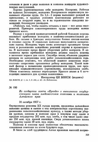 Из сообщения газеты «Правда» о выполнении государственного плана хлебозаготовок совхозами и колхозами Алтайского края. 31 октября 1957 г. // Правда, 1957, 31 окт.
