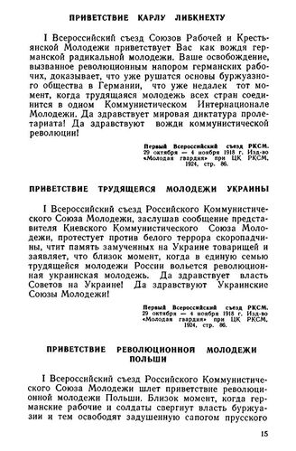 I Всероссийский съезд союзов рабочей и крестьянской молодежи. 29 октября — 4 ноября 1918 года. Приветствие трудящейся молодежи Украины // Первый Всероссийский съезд РКСМ. 29 октября — 4 ноября 1918 г. Изд-во «Молодая гвардия» при ЦК РКСМ, 1924, стр. 86.