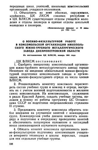 О военно-физкультурной работе в комсомольской организации Никопольского южно-трубного металлургического завода Днепропетровской области. Из постановления ЦК ВЛКСМ, январь 1941 года // ЦА ВЛКСМ.