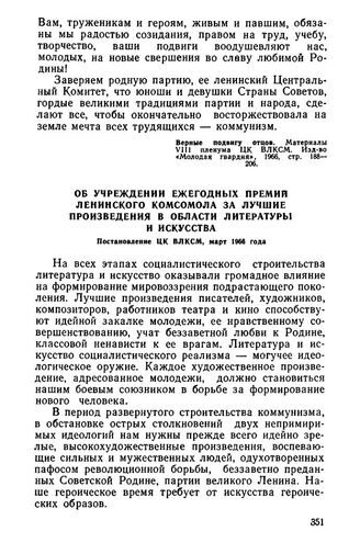 Об учреждении ежегодных премий Ленинского комсомола за лучшие произведения в области литературы и искусства. Постановление ЦК ВЛКСМ, март 1966 года
