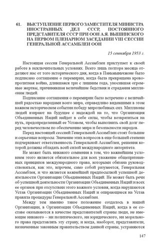 Выступление первого заместителя министра иностранных дел СССР, постоянного представителя СССР при ООН А.Я. Вышинского на первом пленарном заседании VIII сессии Генеральной Ассамблеи ООН. 15 сентября 1953 г. // Известия. – 1953. – 17 сент.