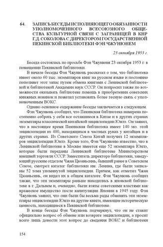 Запись беседы исполняющего обязанности уполномоченного Всесоюзного общества культурной связи с заграницей в КНР Г.Д. Соколова с директором Государственной Пекинской библиотеки Фэн Чжунюнем. 23 октября 1953 г. // АВП РФ. – Ф. 0100. – Оп. – 46. – П. 375. – Д. 134. – Л. 150-151.
