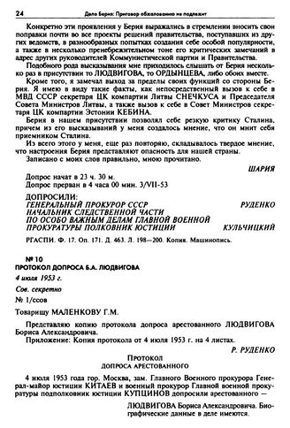 Протокол допроса Б.А. Людвигова. 4 июля 1953 г. // РГАСПИ. Ф. 17. Оп. 171. Д. 463. Л. 204—208. Копия. Машинопись.