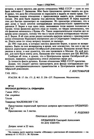 Протокол допроса Г.А. Ордынцева. 7 июля 1953 г. // РГАСПИ. Ф. 17. Оп. 171. Д. 464. Л. 1—4. Подлинник. Машинопись.