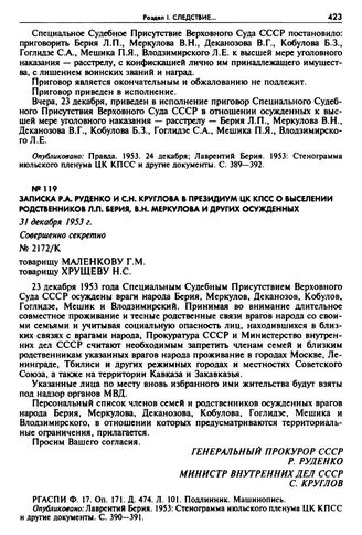 Записка Р.А. Руденко и С.Н. Круглова в Президиум ЦК КПСС о выселении родственников Л.П. Берия, В.Н. Меркулова и других осужденных. 31 декабря 1953 г.