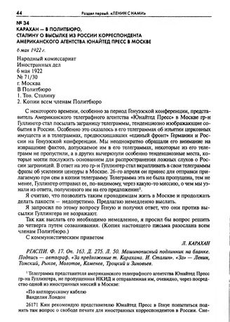 Карахан - в Политбюро, Сталину о высылке из России корреспондента американского агентства Юнайтед Пресс в Москве. 6 мая 1922 г. // РГАСПИ. Ф. 17. Оп. 163. Д. 275. Л. 50. Машинописный подлинник на бланке. Подпись — автограф.
