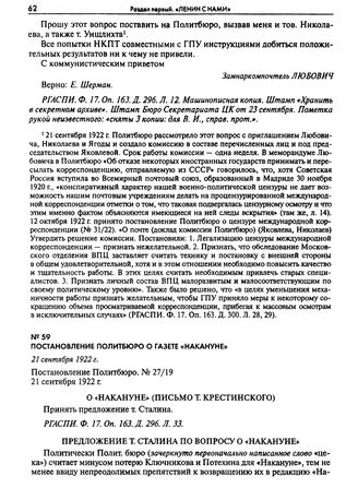 Постановление Политбюро о газете «Накануне». 21 сентября 1922 г. // РГАСПИ. Ф. 17. Оп. 163. Д. 296. Л. 33—36.