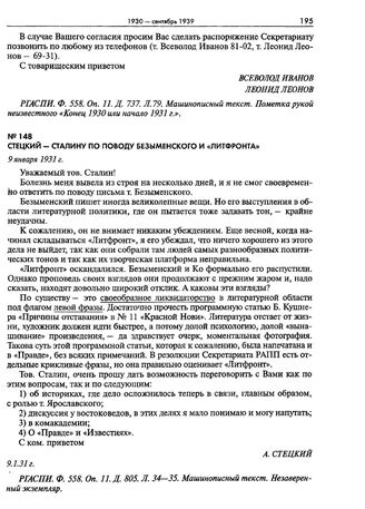 Стецкий - Сталину по поводу Безыменского и «Литфронта». 9 января 1931 г. // РГАСПИ. Ф. 558. Оп. 11. Д. 805. Л. 34—35. Машинописный текст. Незаверенный экземпляр.
