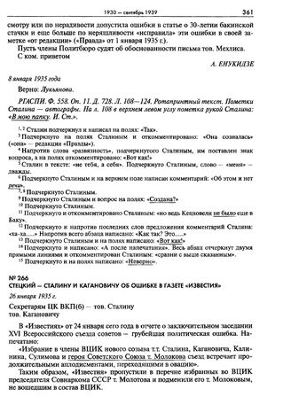 Стецкий - Сталину и Кагановичу об ошибке в газете «Известия». 26 января 1935 г. // РГАСПИ. Ф. 17. Оп. 163. Д. 1052. Л. 123—124. Машинописный подлинник.