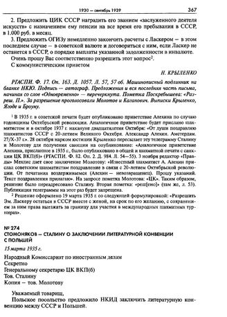 Стомоняков - Сталину о заключении литературной конвенции с Польшей. 15 марта 1935 г. // РГАСПИ. Ф. 17. Оп. 163. Д. 1057. Л. 53—55. Машинописный подлинник на бланке НКИД. Подпись — автограф.