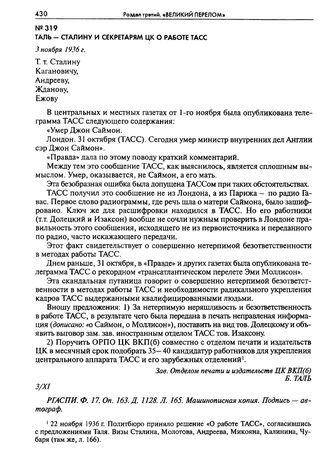 Таль - Сталину и секретарям ЦК о работе ТАСС. 3 ноября 1936 г.
