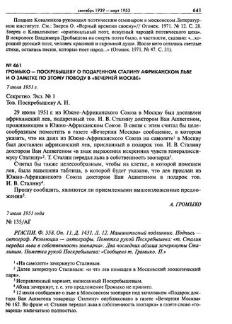 Громыко - Поскребышеву о подаренном Сталину африканском льве и о заметке по этому поводу в «Вечерней Москве». 7 июля 1951 г. // РГАСПИ. Ф. 558. Оп. 11. Д. 1431. Л. 12. Машинописный подлинник. Подпись — автограф. Резолюции — автографы.
