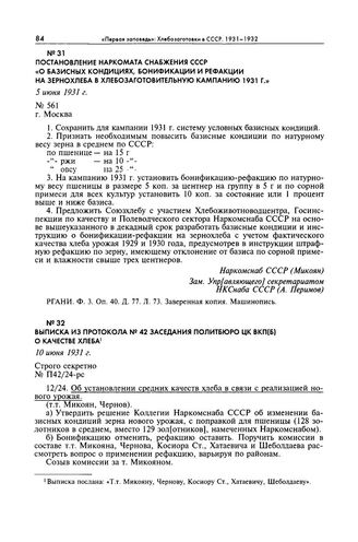 Выписка из протокола № 42 заседания Политбюро ЦК ВКП(б) о качестве хлеба. 10 июня 1931 г.