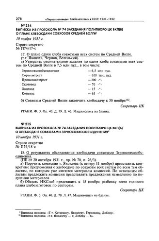 Выписка из протокола № 74 заседания Политбюро ЦК ВКП(б) о плане хлебосдачи совхозов Средней Волги. 10 ноября 1931 г. // РГАНИ. Ф. 3. Оп. 40. Д. 79. Л. 46. Машинопись на бланке.