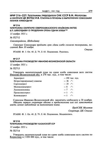 Телеграммы председателя СНК СССР В.М. Молотова и секретаря ЦК ВКП(б) И.В. Сталина в регионы о выполнении совхозами планов хлебосдачи. Телеграмма руководству Иваново-Вознесенской области. 11 ноября 1931 г.