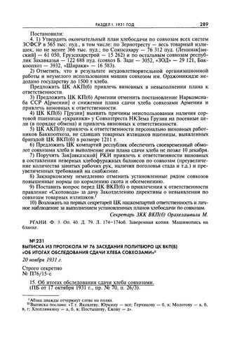 Выписка из протокола № 76 заседания Политбюро ЦК ВКП(б) «Об итогах обследования сдачи хлеба совхозами». 20 ноября 1931 г. // РГАНИ. Ф. 3. Оп. 40. Д. 79. Л. 118. Машинопись на бланке. Опубликовано: Голод в СССР. 1929—1934. Т. 1. Кн. 1. С. 606.