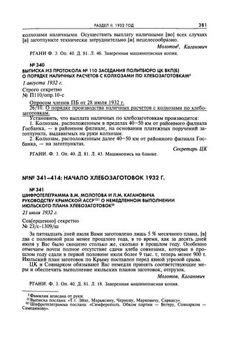 Выписка из протокола № 110 заседания Политбюро ЦК ВКП(б) о порядке наличных расчетов с колхозами по хлебозаготовкам. 1 августа 1932 г.