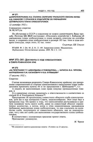 На телеграмму Т.Т. Шеболдаева и Пивоварова - записка М.А. Чернова, направленная Л.М. Кагановичу и В.В. Куйбышеву. 17 августа 1932 г. // РГАНИ. Ф. 3. Оп. 40. Д. 81. Л. 111—112. Подлинник. Машинопись.