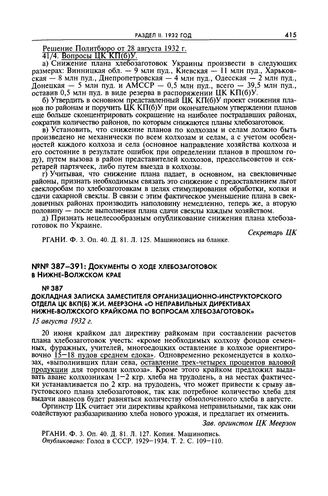 Докладная записка заместителя организационно-инструкторского отдела ЦК ВКП(б) Ж.И. Меерзона «О неправильных директивах Нижне-Волжского крайкома по вопросам хлебозаготовок». 15 августа 1932 г. // РГАНИ. Ф. 3. Оп. 40. Д. 81. Л. 127. Копия. Машинопись. Опубликовано: Голод в СССР. 1929—1934. Т. 2. С. 109—110.