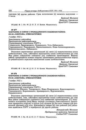 Телеграмма о снятии с промышленного снабжения района из-за «саботажа» хлебозаготовок. 3 ноября 1932 г. [1]