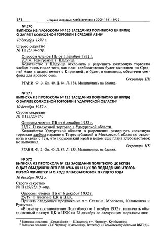 Выписка из протокола № 125 заседания Политбюро ЦК ВКП(б) о запрете колхозной торговли в Удмуртской области. 10 декабря 1932 г. // РГАНИ. Ф. 3. Оп. 40. Д. 84. Л. 135. Машинопись на бланке.